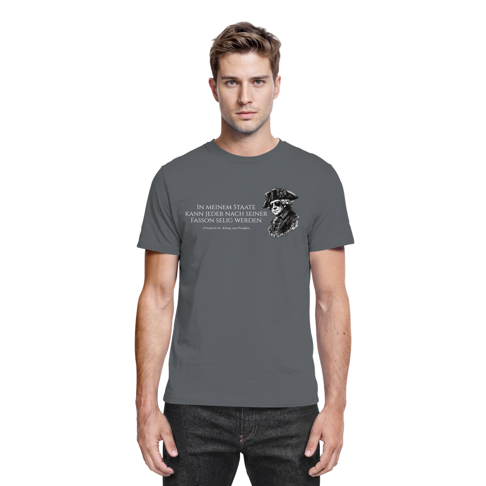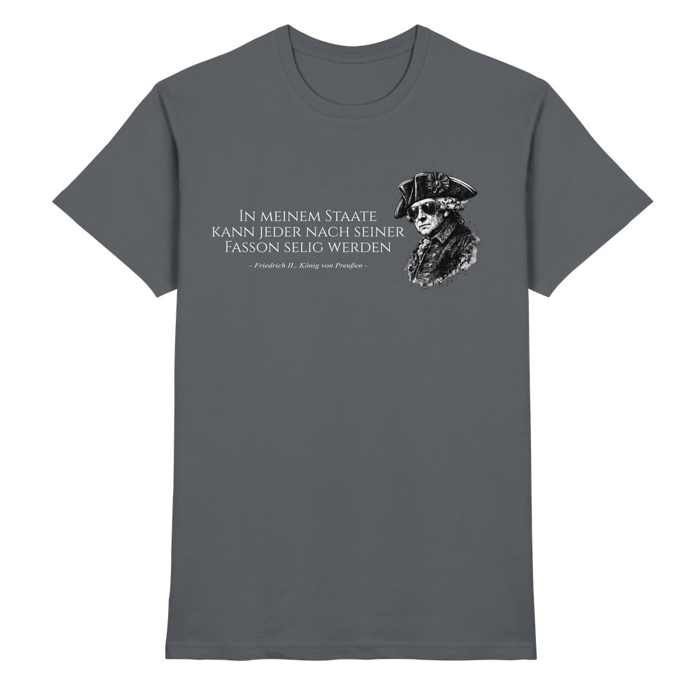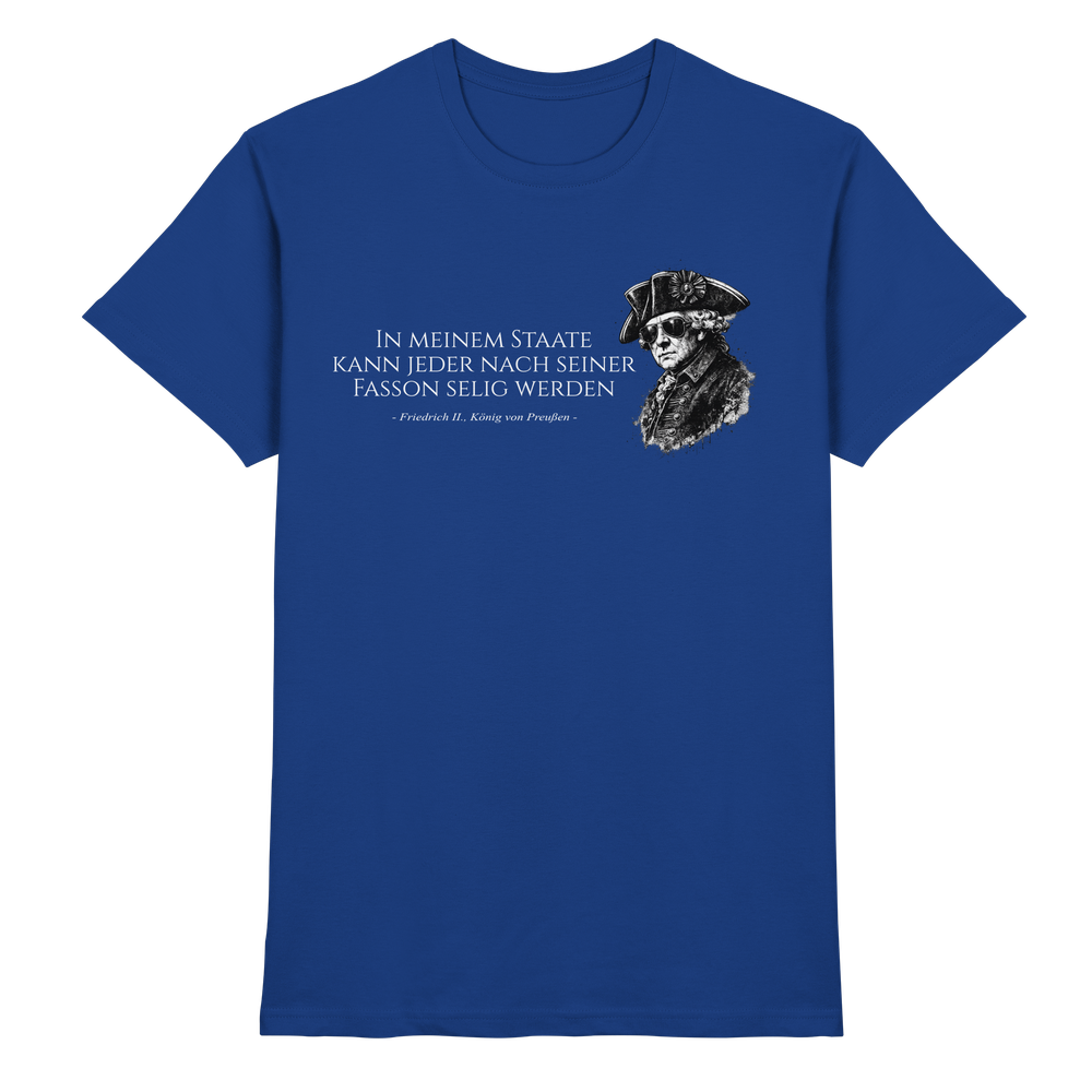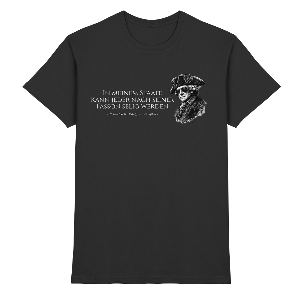Friedrich der Große, bekannt als der „Alte Fritz“, prägte durch seine Reformen, Feldzüge und kulturellen Leistungen eine ganze Epoche. Dieses Preußen T-Shirt verbindet historisches Bewusstsein mit modernem Tragekomfort – ein würdiges Tribute an den Philosophen auf dem Königsthron.